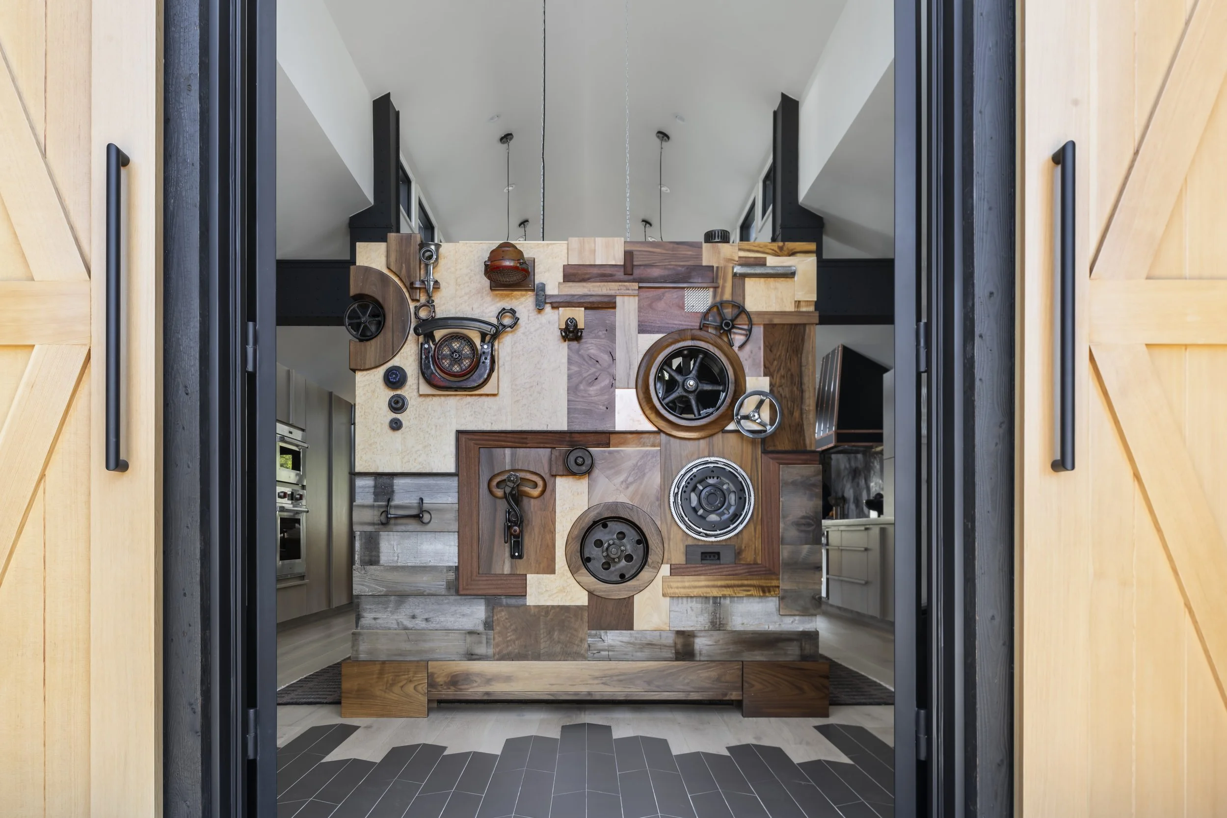 The home’s standout design features don’t stop there. A custom industrial-inspired entry sculpture—crafted from farm machinery with integrated lighting—acts as a visual anchor, separating the entry from the dining space. And tucked behind the kitchen? A black-and-white striped laundry room, cleverly concealed behind a hidden cabinet.